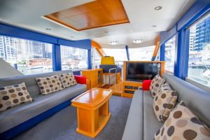 This yacht pairs perfectly with our VIP catering. Or you can select our BBQ catering if you don’t need a live chef.  Our BBQ catering special includes kabobs (both beef and chicken), other meat selections, salad, appetizers, desert, soda and a few extras.  There will be plenty of amazingly delicious food to enjoy. Our VIP catering package includes the BBQ Catering with the addition of seafood.  We add grilled prawns (shrimp) and fresh fish to the menu.  The VIP package also includes a live chef! He’ll cook everything on the grill onboard the yacht made to order!